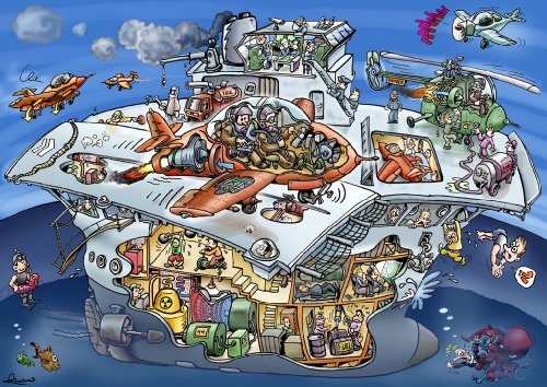This 301 piece puzzle features Dutch cartoonist Peter Welleman's take on an aircraft carrier. The puzzle pieces were also designed by Peter Welleman and include a number of themed whimsy pieces (click on the small picture below the puzzle picture to see example pieces for this puzzle). Puzzle is made with 1/4" wood and comes packaged in a wood box. Read more...
