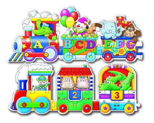 Two five feet long, 30 piece colorful cargo train puzzles: one teaching color, counting and number recognition and one teaching the alphabet. Read more...