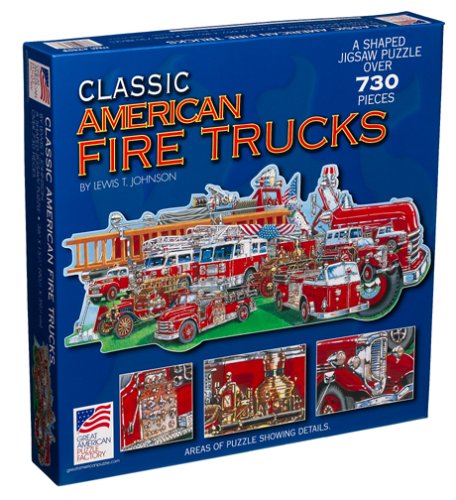 This 730-piece, shaped, jigsaw puzzle features 11 fire trucks from the early 20th century through now. From the horse drawn steam pumper to the present day Quint with an aerial ladder and a 500-gallon water tank. The back of the box identifies each type of historic fire engine and it's use. Puzzle measures over 3 feet long and 15 ½ inches tall when completed. Read more...