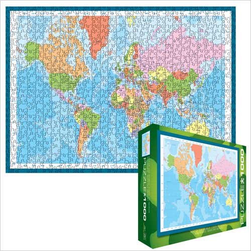 Map of the World. 1000 piece puzzle. 26.5 x 19.25 inches. This modern map of the world includes major cities as well. This superior quality puzzle will delight and educate all at the same time. Strong high-quality pieces that won't break. Easy fit puzzle pieces. Made from recycled board. Read more...
